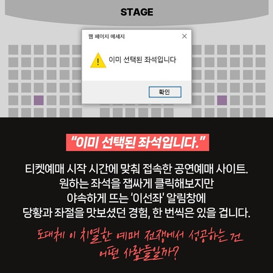 원하는 좌석을 잽싸게 클릭해보지만 야속하게 뜨는 ‘이선좌’ 알림창에 당황과 좌절을 맛보셨던 경험, 한 번씩은 있을 겁니다. 도대체 이 치열한 예매 전쟁에서 성공하는건 어떤 사람들일까?