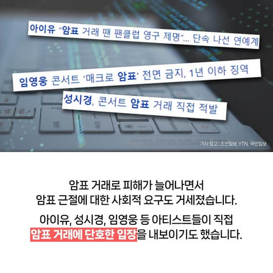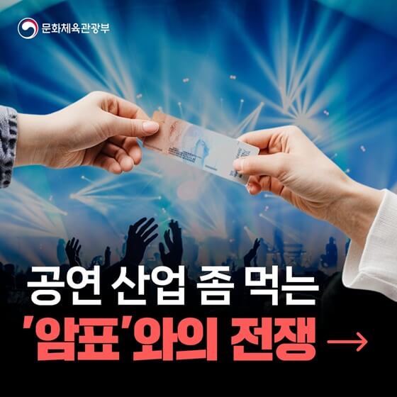 아이유, 성시경, 임영웅 등 아티스트들이 직접 암표 거래에 단호한 입장을 내보이기도 했습니다. 이에 문화체육관광부는 「공연법」 일부 개정을 거쳐 암표 뿌리 뽑기에 나섭니다.
