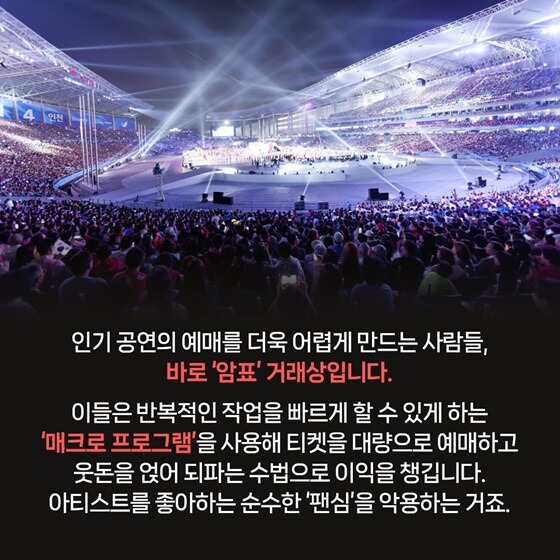 인기 공연의 예매를 더욱 어렵게 만드는 사람들, 바로 ‘암표’ 거래상입니다. 이들은 반복적인 작업을 빠르게 할 수 있게 하는 ‘매크로 프로그램’을 사용해 티켓을 대량으로 예매하고 웃돈을 얹어 되파는 수법으로 이익을 챙깁니다. 아티스트를 좋아하는 순수한 ‘팬심’을 악용하는 거죠. 암표 거래로 피해가 늘어나면서 암표 근절에 대한 사회적 요구도 거세졌습니다.