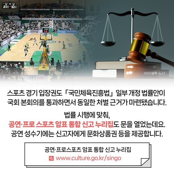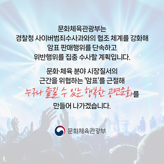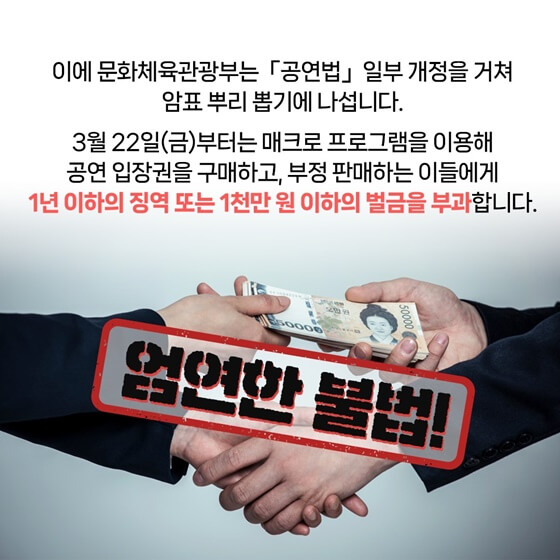 3월 22일(금)부터는 매크로 프로그램을 이용해 공연 입장권을 구매하고, 부정 판매하는 이들에게 1년 이하의 징역 또는 1천만 원 이하의 벌금을 부과합니다. 스포츠 경기 입장권도 「국민체육진흥법」 일부 개정 법률안이 국회 본회의를 통과하면서 동일한 처벌 근거가 마련됐습니다. 법률 시행에 맞춰, 공연·프로 스포츠 암표 통합 신고 누리집도 문을 열었는데요. 공연 성수기에는 신고자에게 문화상품권 등을 제공합니다. 문화체육관광부는 경찰청 사이버범죄수사과와의 협조 체계를 강화해 암표 판매행위를 단속하고 위반행위를 집중 수사할 계획입니다. 문화·체육 분야 시장질서의 근간을 위협하는 ‘암표’를 근절해 누구나 즐길 수 있는 행복한 공연문화를 만들어 나가겠습니다.