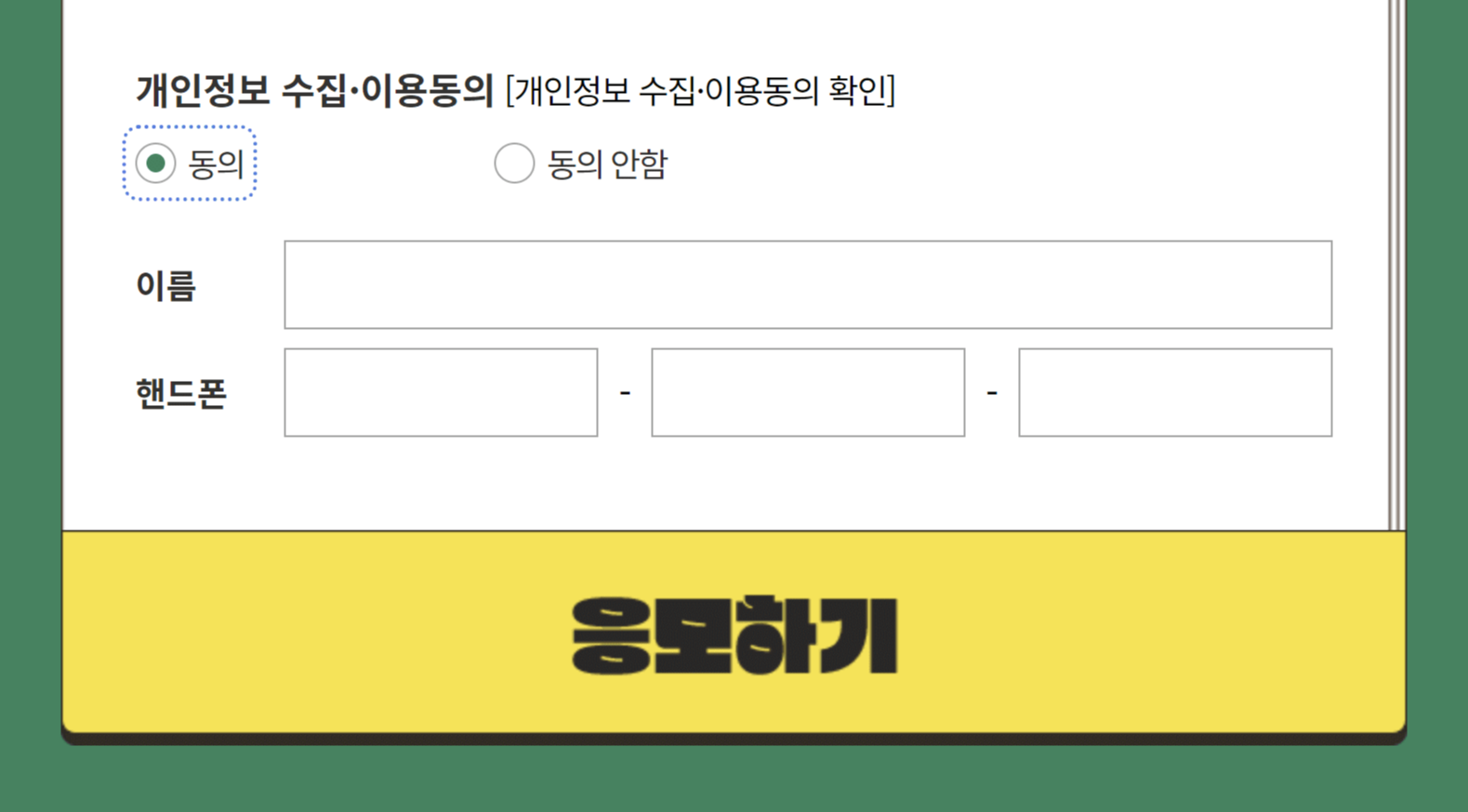 개인정보 수집, 이용동의에 체크를 하시고 이름과 핸드폰 번호를 작성한 후 응모하기 버튼을 누르십시오.