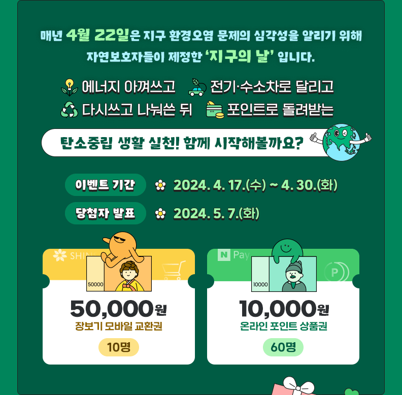 4월 17일~ 4월 30일까지 참여할 수 있으며, 당점차 5월 7일(화)에 발표합니다. 당첨선물로는 5만 원권 장보기 모바일 상품권과 1만 원권 온라인 포인트 상품권이라고 하니 한 번씩 참여해 보셔서 당첨의 기회도 잡아보세요.